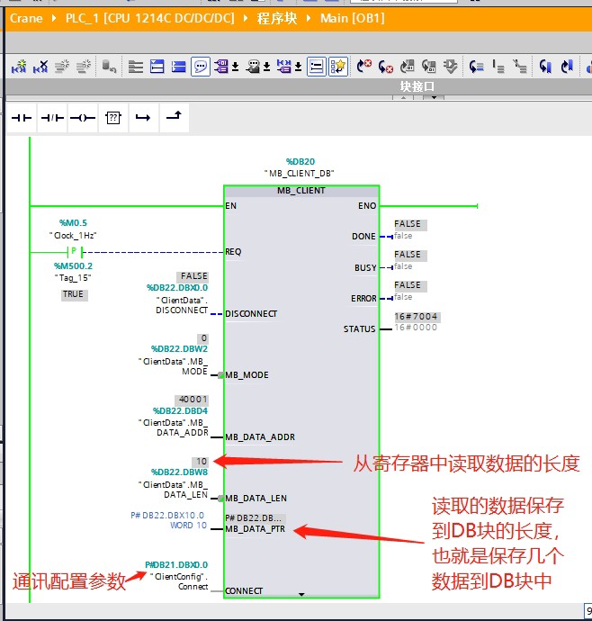 MB_PORT:还是502端口。ID:连接标识。CONNECT和DISCONNECT:控制连接状态。REQ:上升沿触发一次通讯请求。ADR:关联本地存储数据的数据块地址。DATA_ADDR:指定服务器端的数据地址。DATA_LEN:指定读取或写入的数据长度。