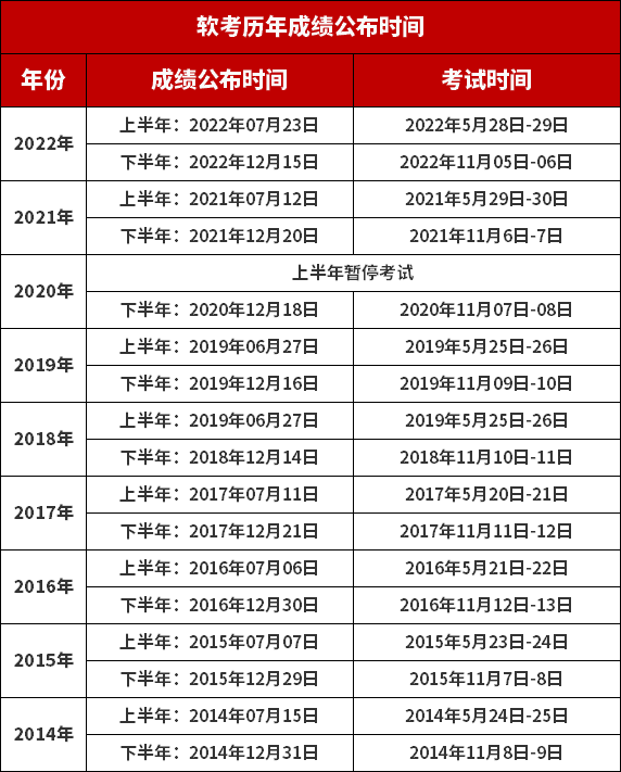 软考各个科目的成绩查询时间都是一致的,一般在考后一个月就能查询成绩,下面是软考历年成绩公布时间以及间隔规律表: