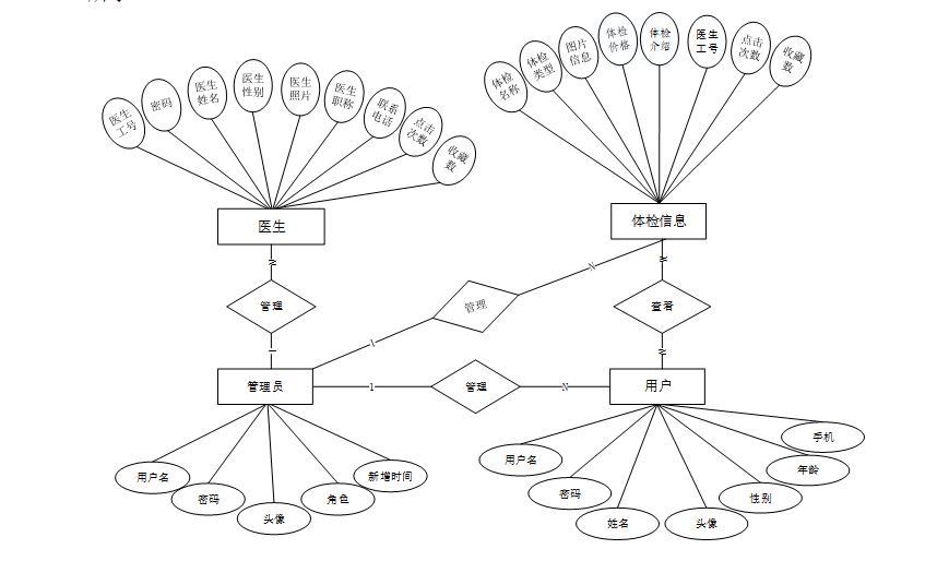 E-R图也可称为实体-联系图,其可以清楚的显示实体与实体之间的关系,是描述概念模型的有效方式,通过各实体间的关系方便数据库结构的设计。在系统中将对 “管理员、用户、医生、体检信息”等几个主要的实体属性进行布局,如图4-2所示: