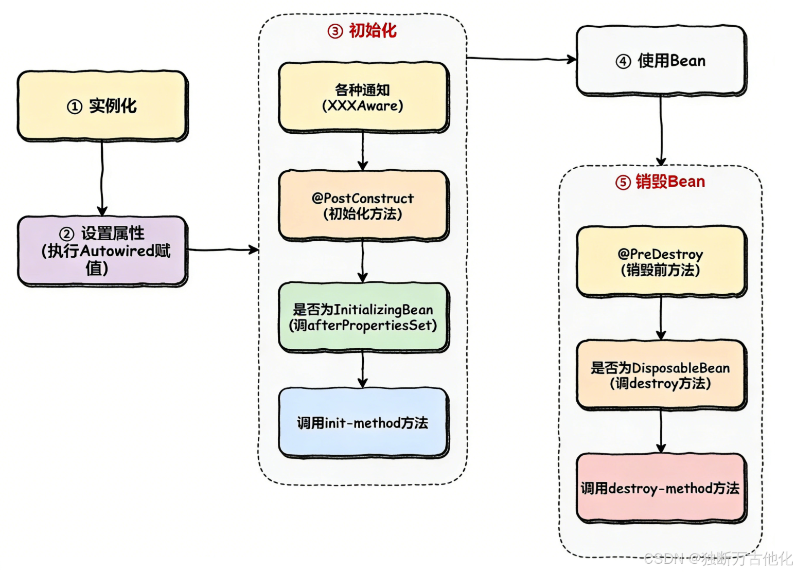 生命周期指的是一个对象从诞生到销毁的整个生命过程,我们把这个过程就叫做一个对象的生命周期。 Bean 的生命周期分为以下5个部分: