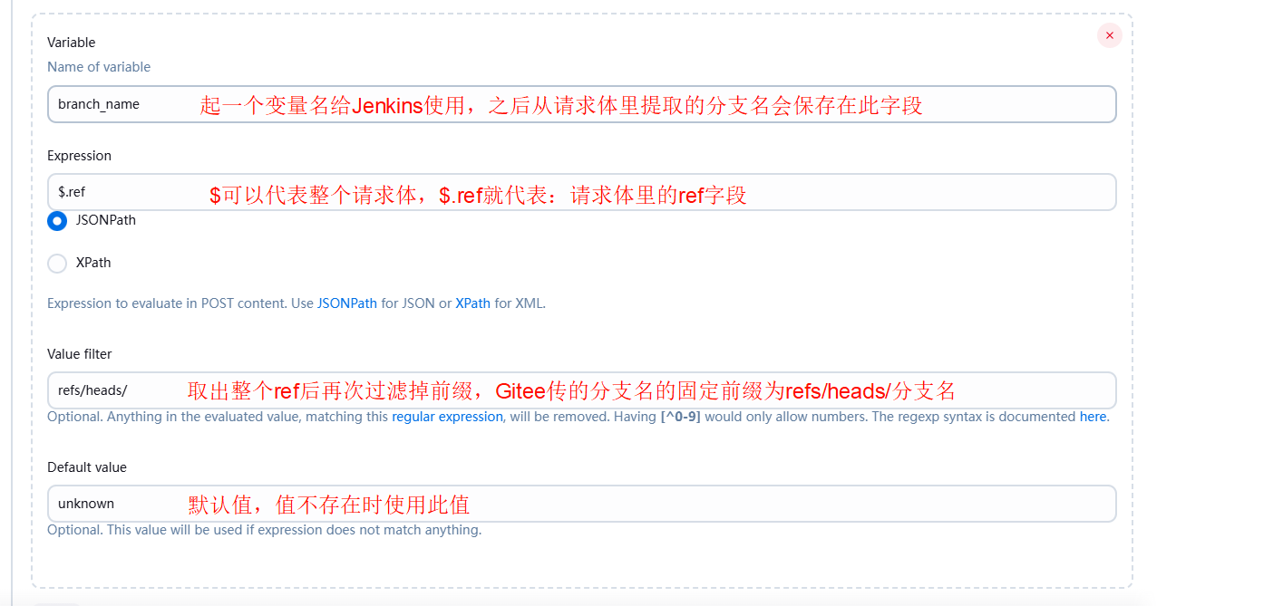 以下为Gitee通过webhook发送的请求体,其中包含了分支字段,需要做的配置就是提取分支字段并过滤掉其他分支。