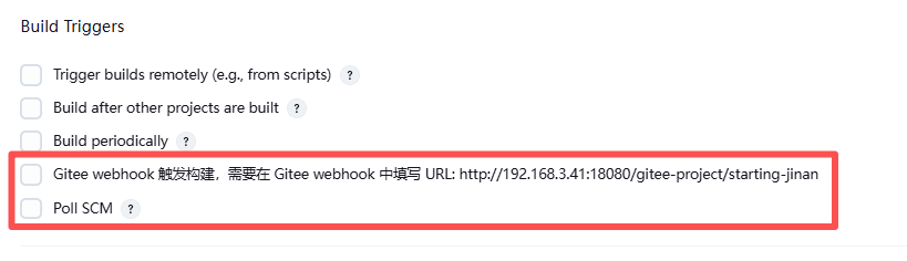 继续往下配置触发器。使用webhook实现的效果为Gitee检测到代码提交时会主动推送事件到jenkins,此选项要保证服务器可以连接外网。使用Poll SCM的效果是jenkins定时拉取代码,此选项不需要连接外网。这里我使用Poll SCM每5分钟拉取一次(目录十二已实现Gitee主动推送)。