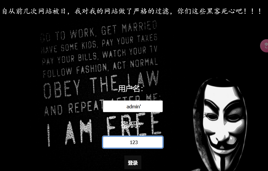 用户名:admin 密码:123' or '1'='1' #