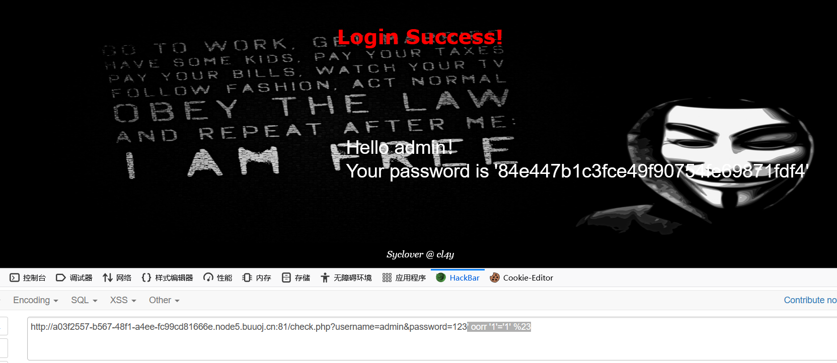这里依旧使用Hackbar扩展 Load URL后直接在URL上加上参数or '1'='1' #