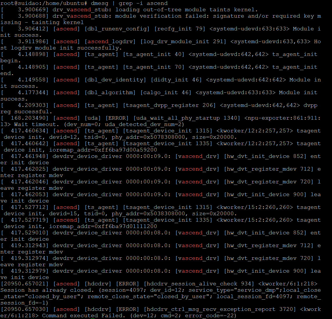 [ 168.203490] [ascend] [uda] [ERROR] [uda_wait_all_phy_startup 1340] Wait timeout. (dev_num=0; uda_detected_dev_num=2)