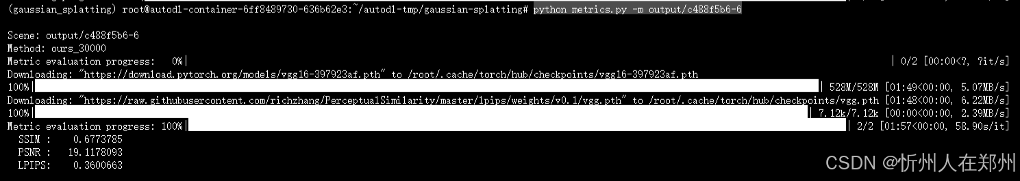 可以参考解决3DGS中评估模型时出现“Unable to compute metrics for model”的问题解决方案,但是博主试了没用,或者可以重新从六、评估章节重新训练,渲染,注意不要点开训练后的结果图片文件,当执行完上述命令再查看图片(博主这样做就可以了,可能是在服务器点击图片查看后就会生成.ipynb_checkpoints文件,从而导致上述报错)。