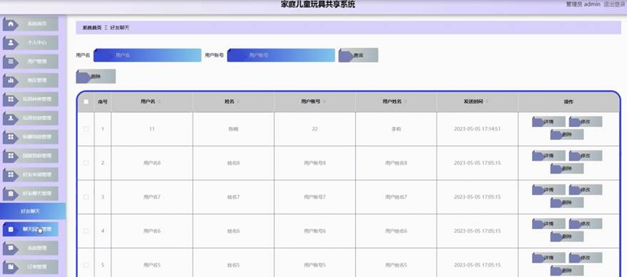 管理员点击好友聊天管理。在好友聊天页面输入用户名和用户账号进行查询和删除好友聊天列表,并根据需要对好友聊天详情信息进行详情、修改或删除操作;如图5-13所示:
