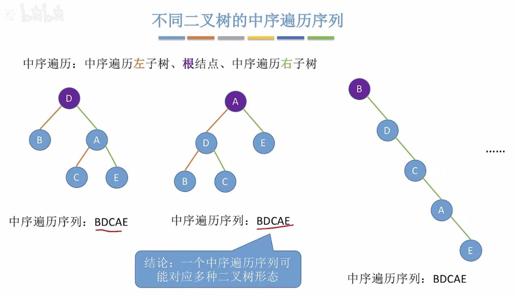 - 中序:BDC A E–>BDC是左子树,E是右子树。