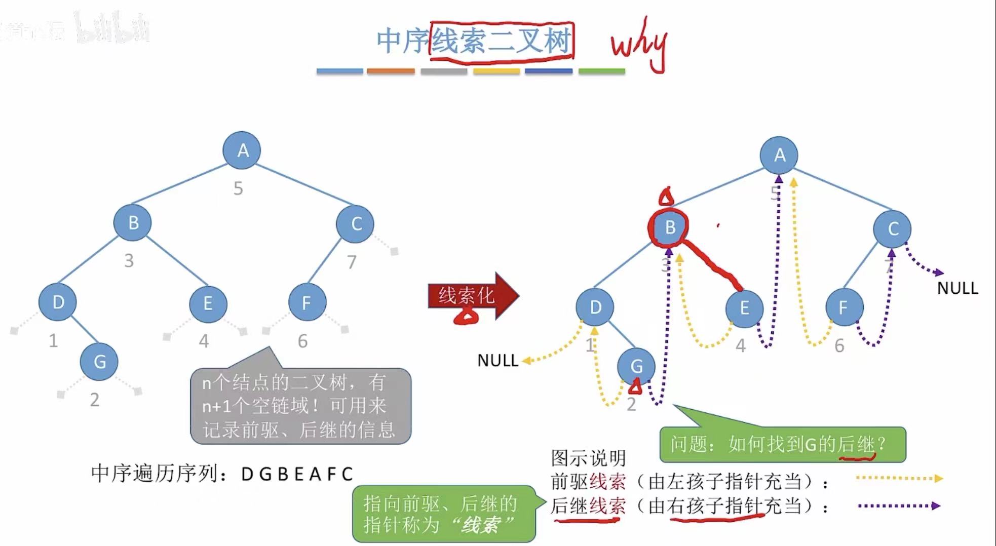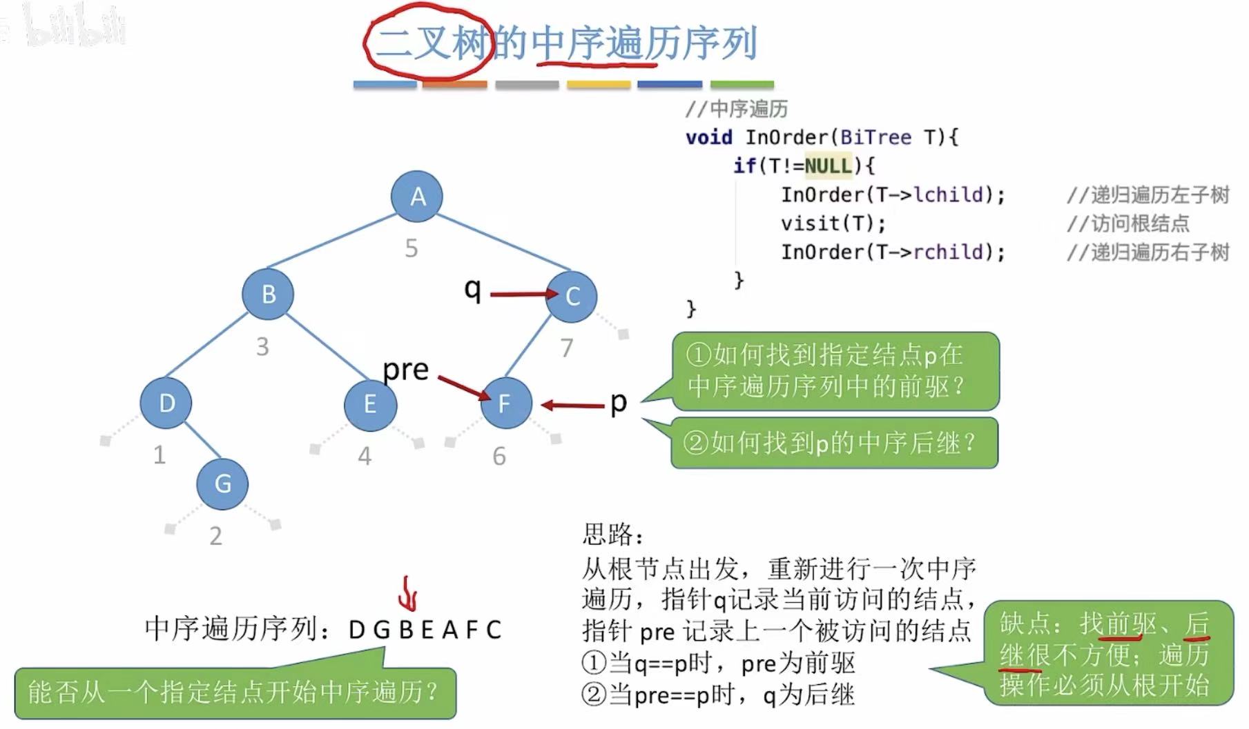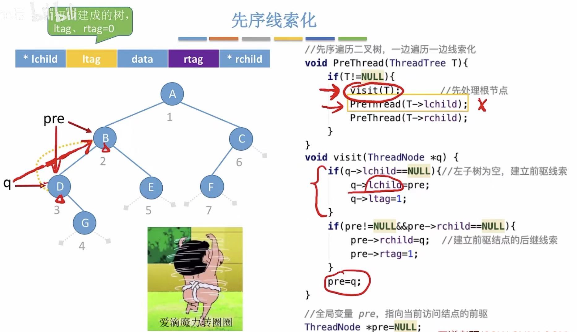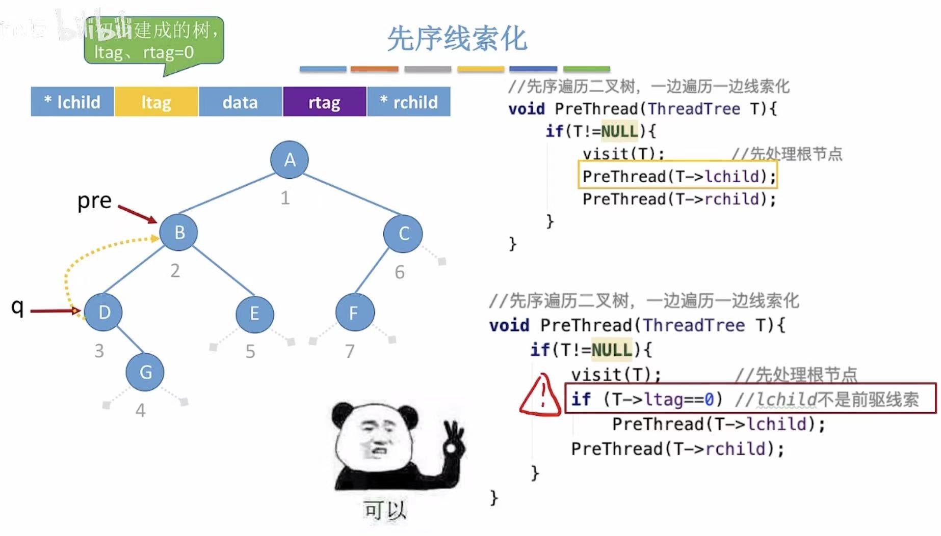 visit(T):当pre指向B,也就是q指向D且将D结点线索化的时候(D的左侧指针指向B)PreThread(T->lchild):需要继续对D的左孩子进行处理- 这里会误将B认为D的左孩子(因为上一步线索化让这两个结点连在了一起)