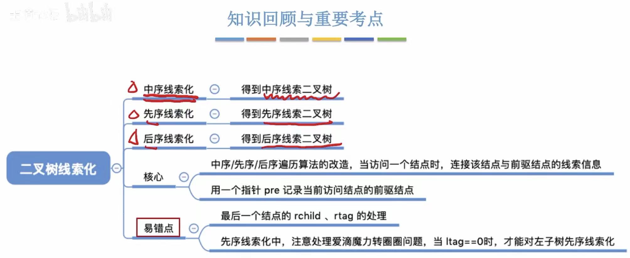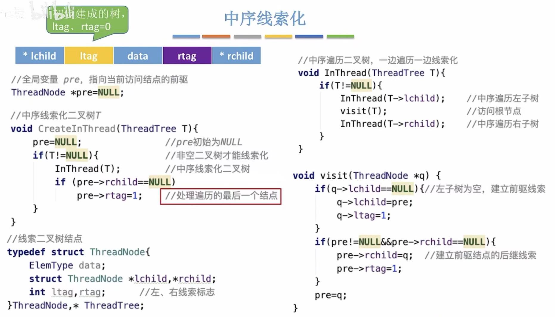 pre->rtag = 1; // 将其右指针设为线索,指向后继(无后继,但可标记)