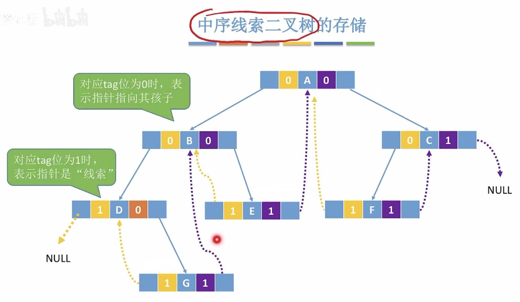 - D无前驱,所以黄色指针指向NULL;