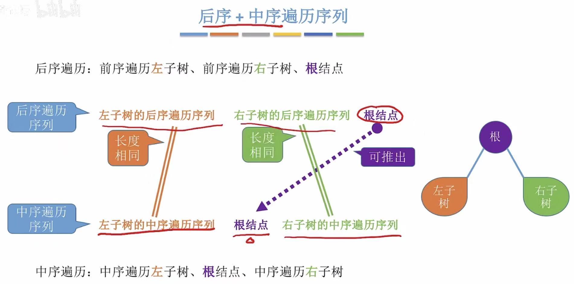 - 中序:根据后序的根节点,分割出左子树和右子树