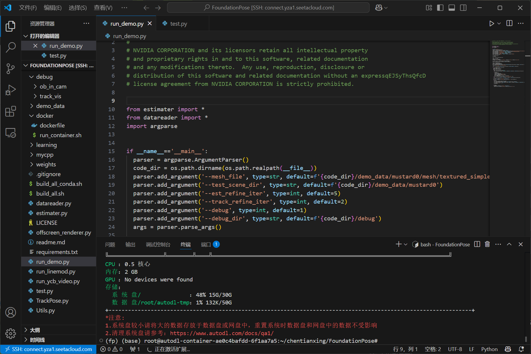 这时候如果你处于开卡模式去打开文件夹运行run_demo.py应该是会出现这个错误。(下图为foundationpose)(没错你不用大费周章的去重新配置环境,社区已经有人给你配置好了感动)