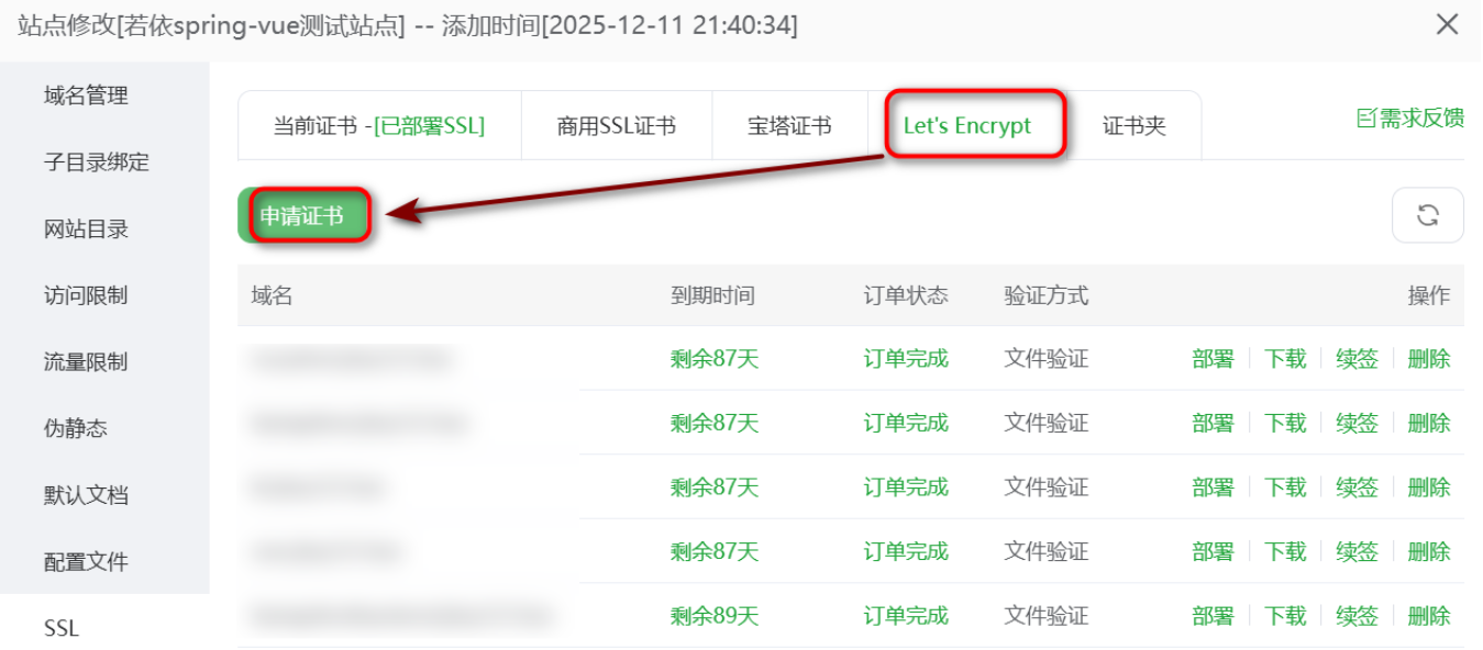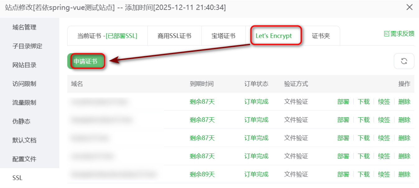 Lets Encrypt证书,然后勾选域名就可以申请了,很简单