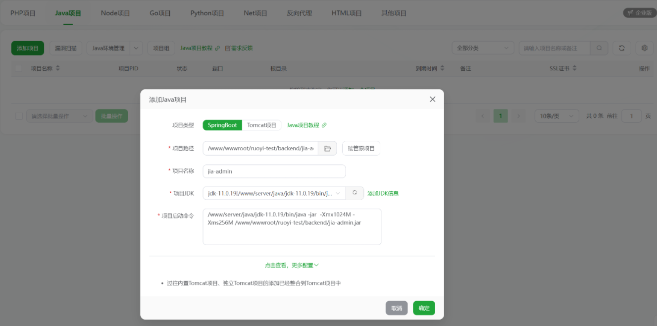 创建为java项目并添加jdk信息(你可以下载宝塔里面的jdk,而可以上传自己的jdk)