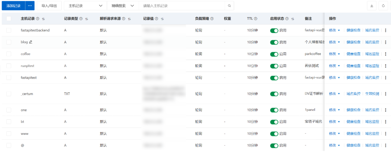 首先,你得需要域名是吧,取阿里或腾讯注册一个,然后进行子域名划分(域名云解析),如图(记录值就是你的服务器的主机地址)