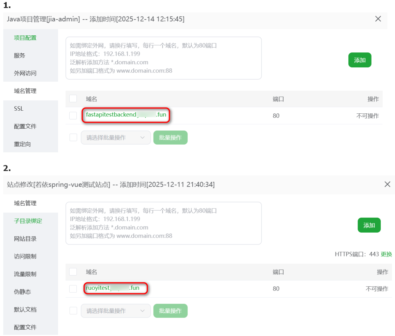 然后对前后端进行域名配置(要和你上面域名划分的要一样)