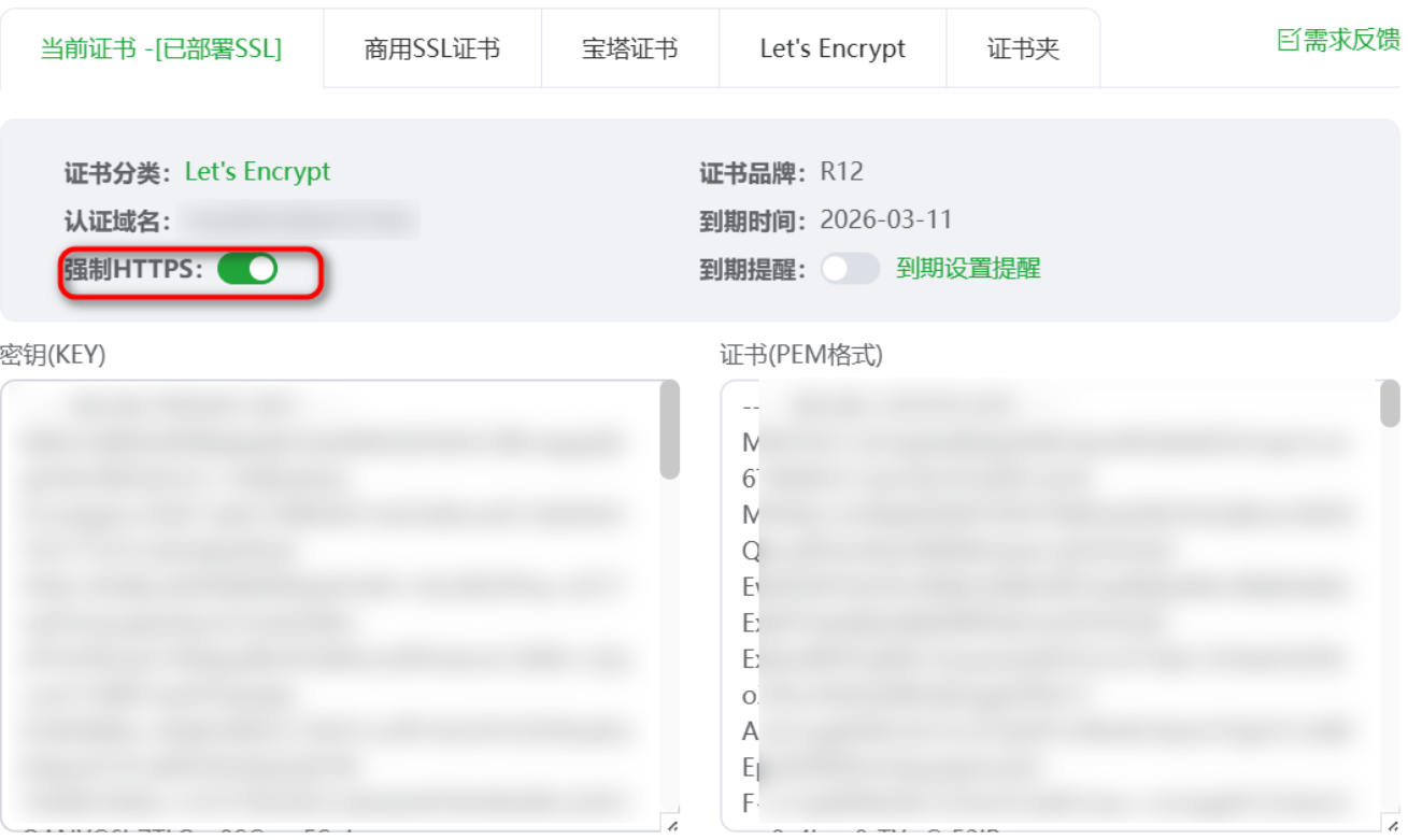 申请好证书后可以开启强制https访问
