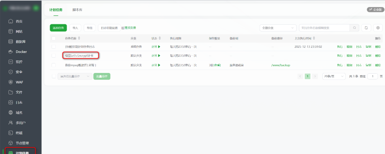 Lets Encrypt证书有效期只有三个月,到期了怎么办,有的孩子,有的,宝塔有任务计划,可以自动执行证书续签脚本,只有执行周期小于三个月就可以实现永久续杯。