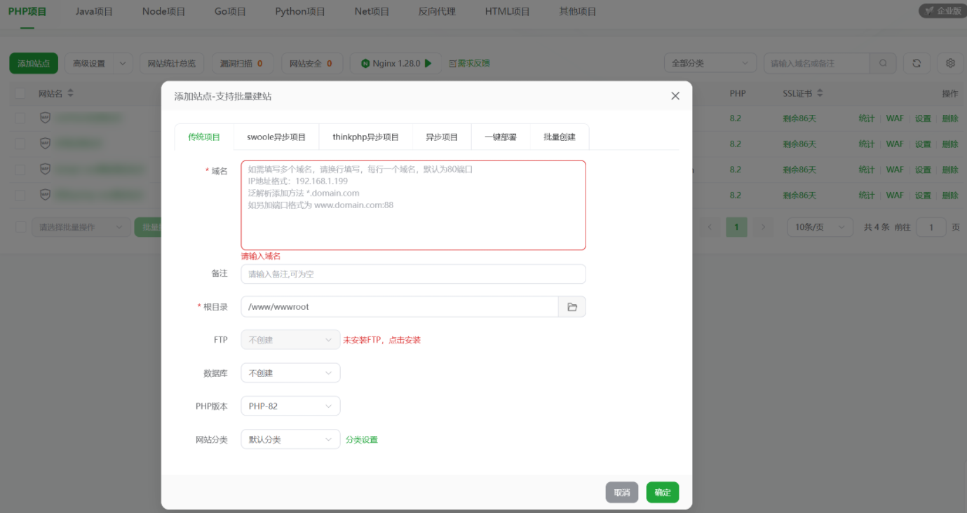 然后创建php站点如下,域名可以选择IP地址格式或者已经解析的域名,根目录选择上面的dist文件夹,下面的配置不用改