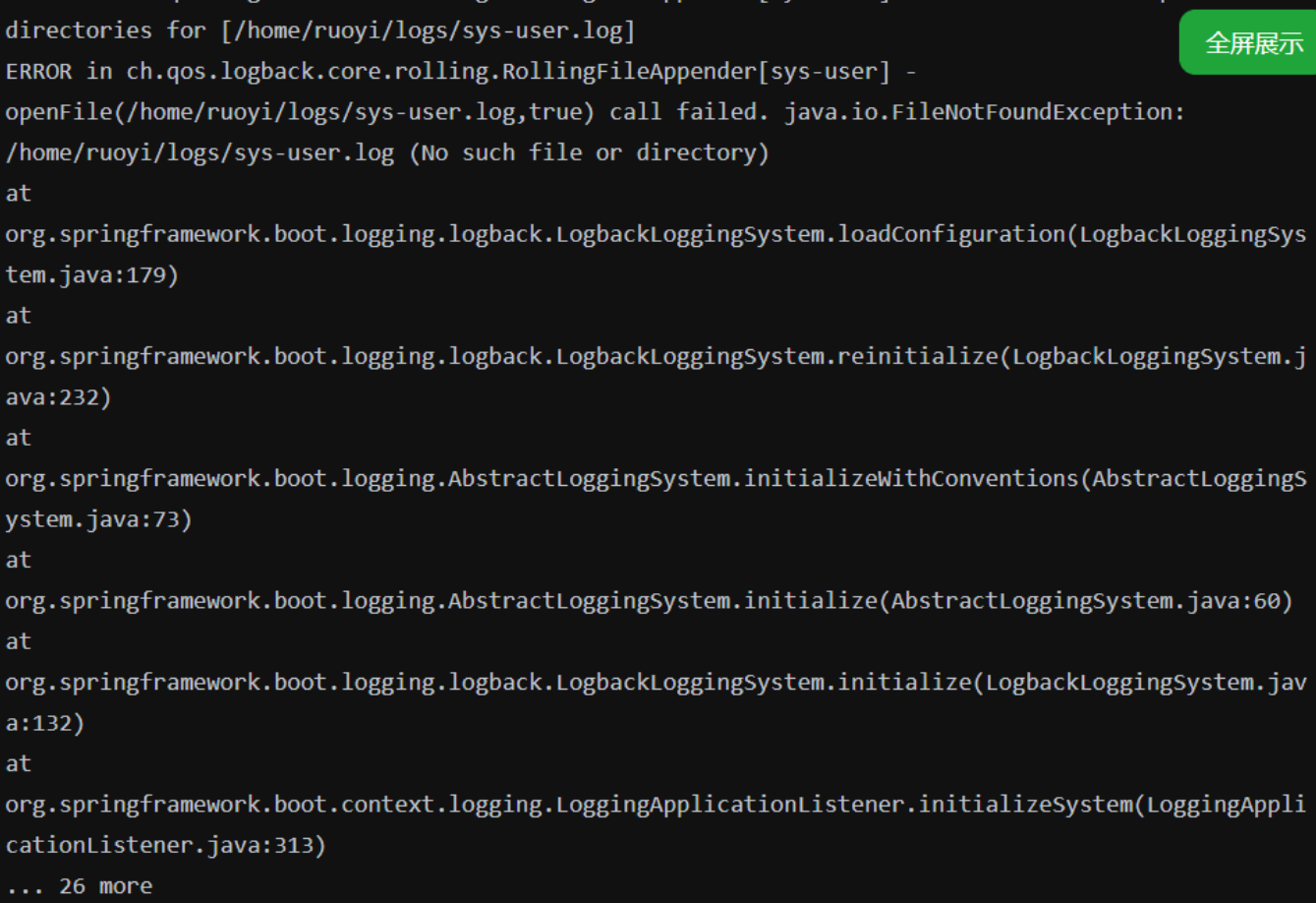 然后项目报错如图,分析了一下大概是说我服务器没有若依配置中的日志存储路径