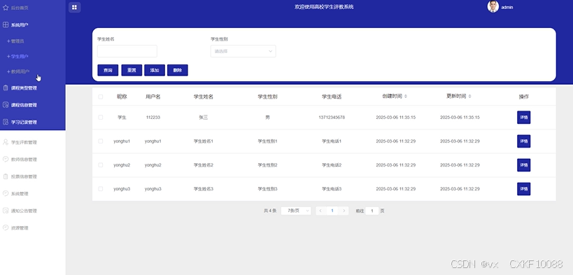 During the design, the system deeply analyzes the user roles and business needs, and divides the different use scenarios and functional requirements of students, teachers and managers. Student users can log in to register, browse the course and teacher details, and easily submit comments; teacher users can consult the course information, students' learning situation and feedback of evaluation results; managers have comprehensive system management authority, covering user account, course arrangement and maintenance of evaluation data.