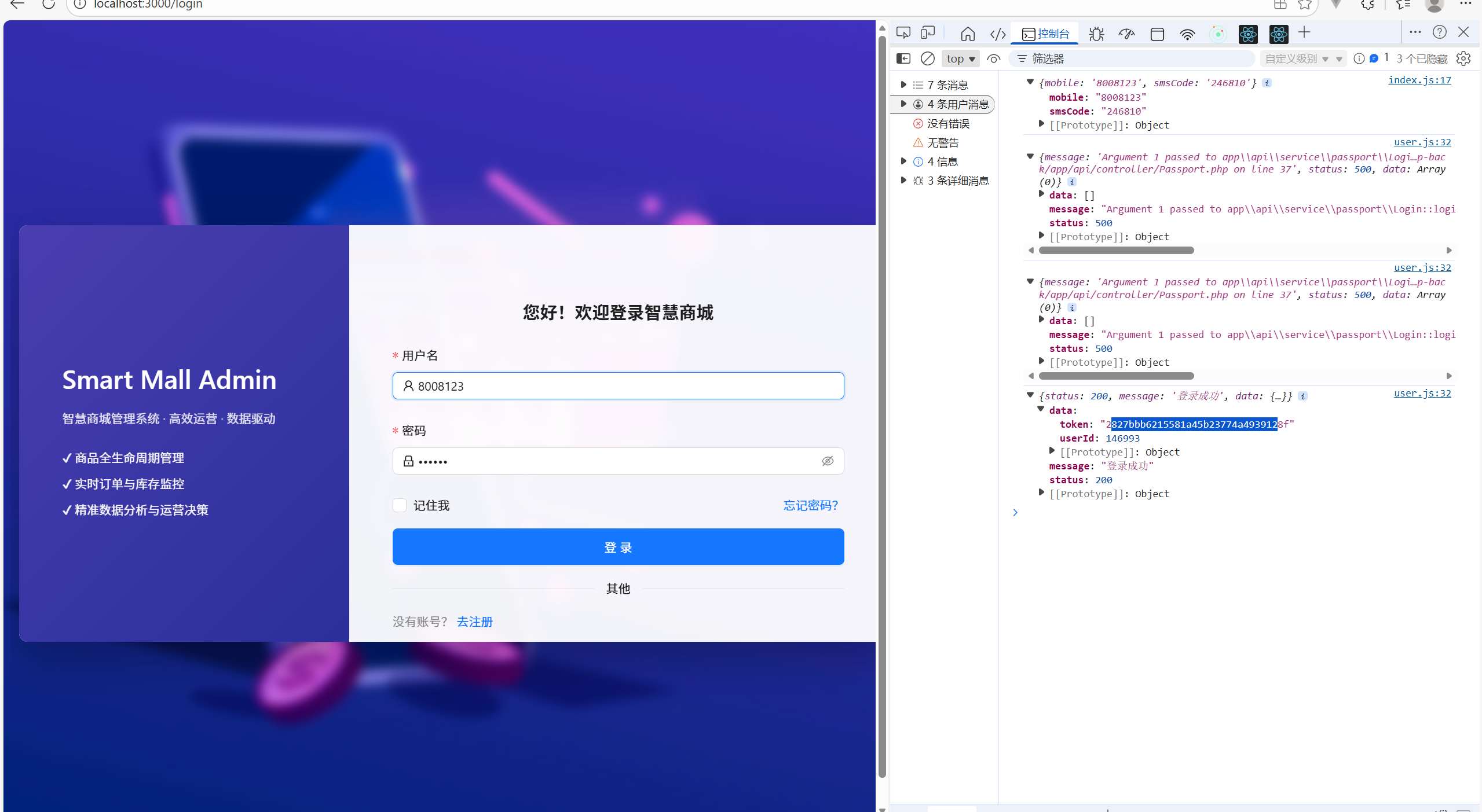 将username和password的name改成mobile字段和smsCode字段,然后再onFinish函数中传过去form,Login的index.js如下: