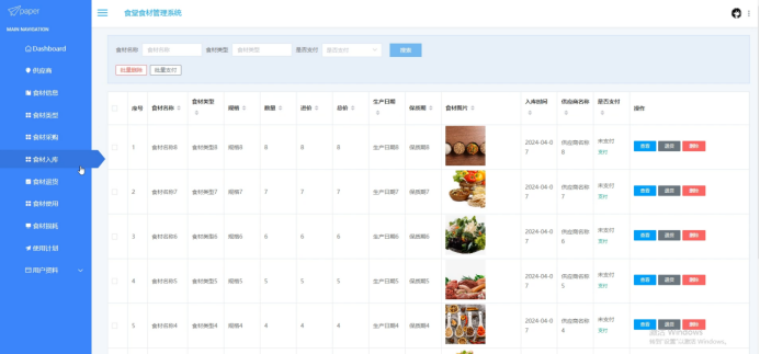 食材入库;在食材入库页面输入食材名称、食材类型、是否支付进行搜索、批量删除或批量支付食材入库列表,并对食材入库详细信息进行查看、退货或删除操作;如图5-8所示: