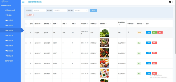 食材采购;在食材采购页面输入食材名称、食材类型、是否通过进行搜索或批量删除食材采购列表,并对食材采购详细信息进行查看、修改或删除操作;如图5-7所示: