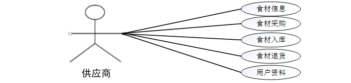 供应商登录系统所涉及到的功能主要有食材信息、食材采购、食材入库、食材退货、用户资料等功能。供应商用例如图3-2所示。