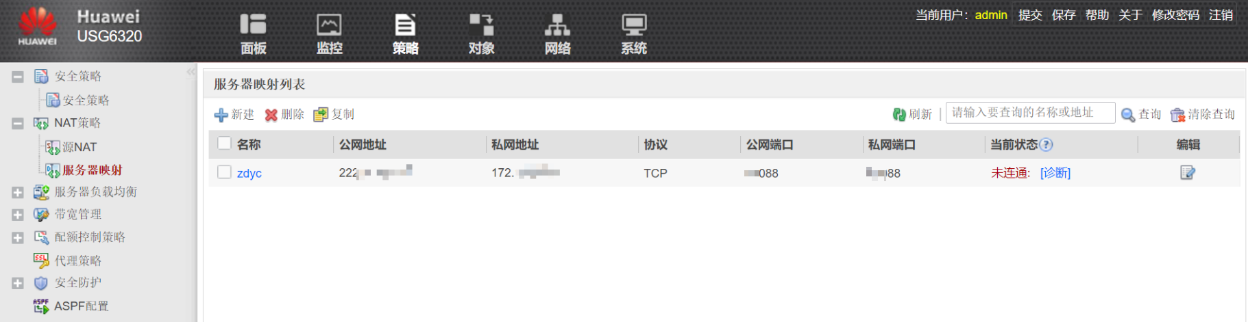参照上面的新建NAT安全策略,将内网的端口加入到安全策略中。内外网端口不一致时,也只加内网端口,不需要给外网端口加安全策略。