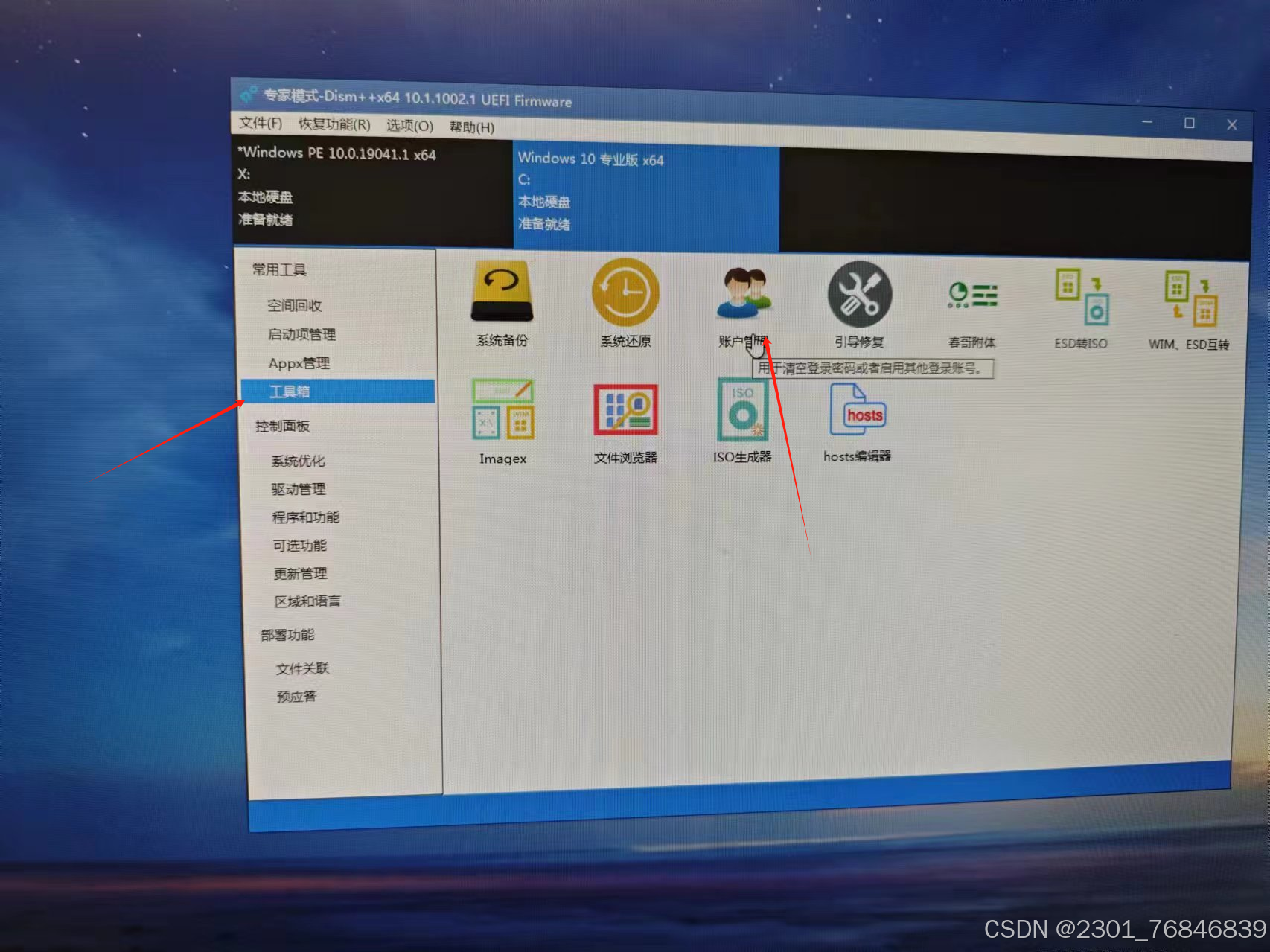 3.3打开软件后,我们不用默认的X盘,选择C盘,点击常用工具里面的工具箱,再点击账户管理,然后选择要清空密码的用户,之后点击左下角,重启电脑,再次开机后,可以发现电脑不需要密码也能进入了。