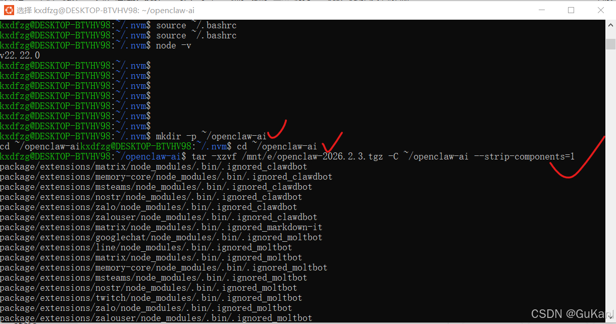 sudo tar -xzvf /mnt/e/node-v22.22.0-linux-x64.tar.gz -C /usr/local/lib/nodejs