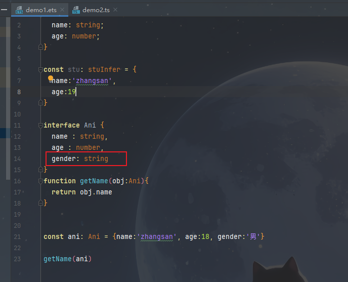 在 TypeScript 中,ani 虽然多了一个 gender 属性,但由于它包含 Ani 接口所需的全部字段,因此可以顺利通过类型检查: