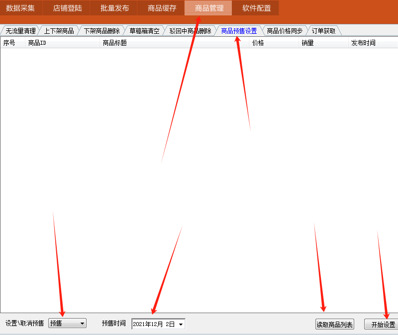 2.点“读取商品列表”,选择要设置预售的商品;