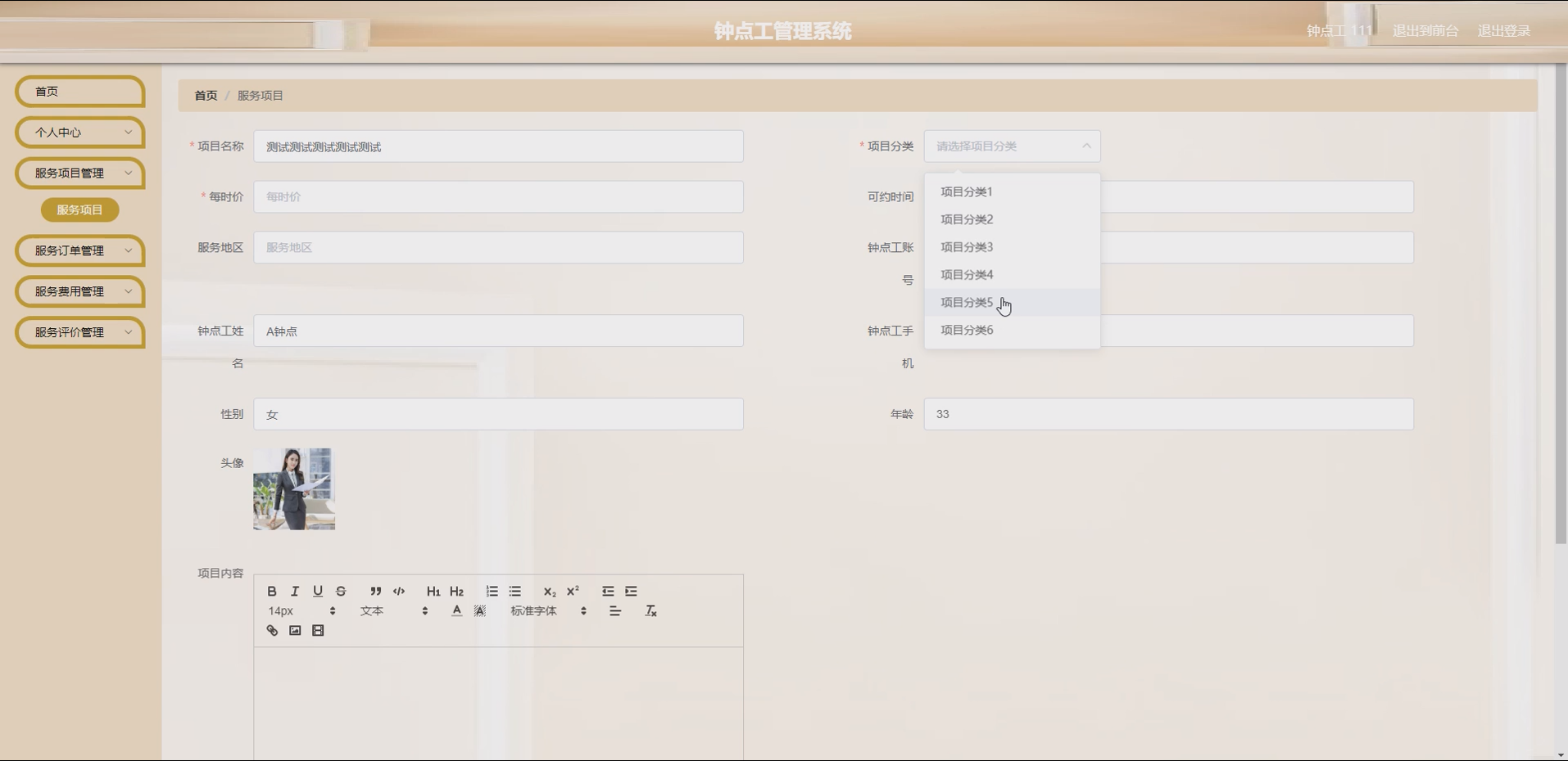 项目分类模块:实现服务项目分类的添加、修改、删除、查询功能,如将服务分为保洁类、保姆类、维修类、护理类等,方便用户快速筛选需求;