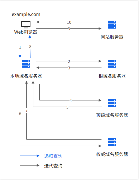 递归 DNS 服务器需逐级向上级服务器查询,直至获取权威记录: