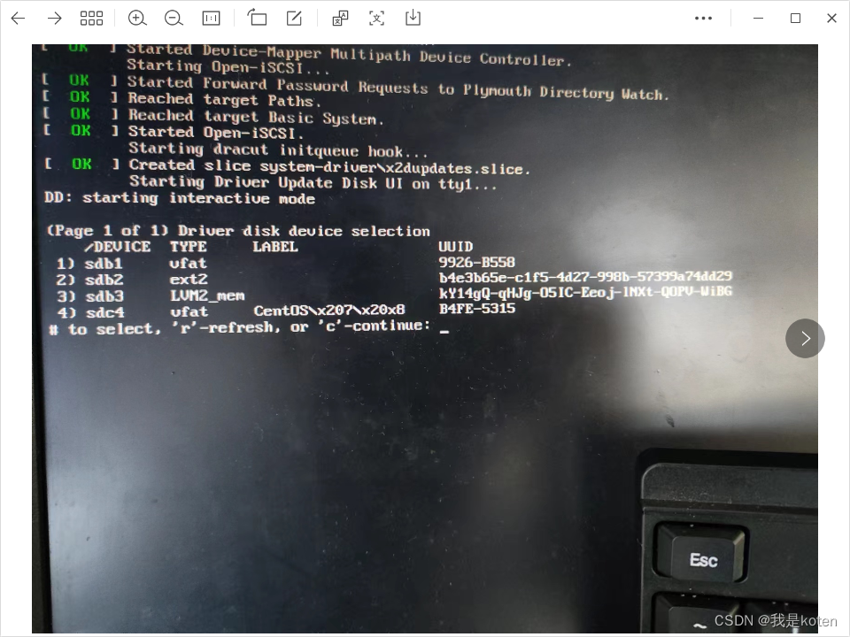 此时要按e,进入编辑界面,将inst.stage2=hd:LABEL=CentOS 7 x86_64 rd.live.check quiet 改为:linux dd,按ctrl + x 执行,你会看到下面界面,记住label是CentOS的device名称sdc4。