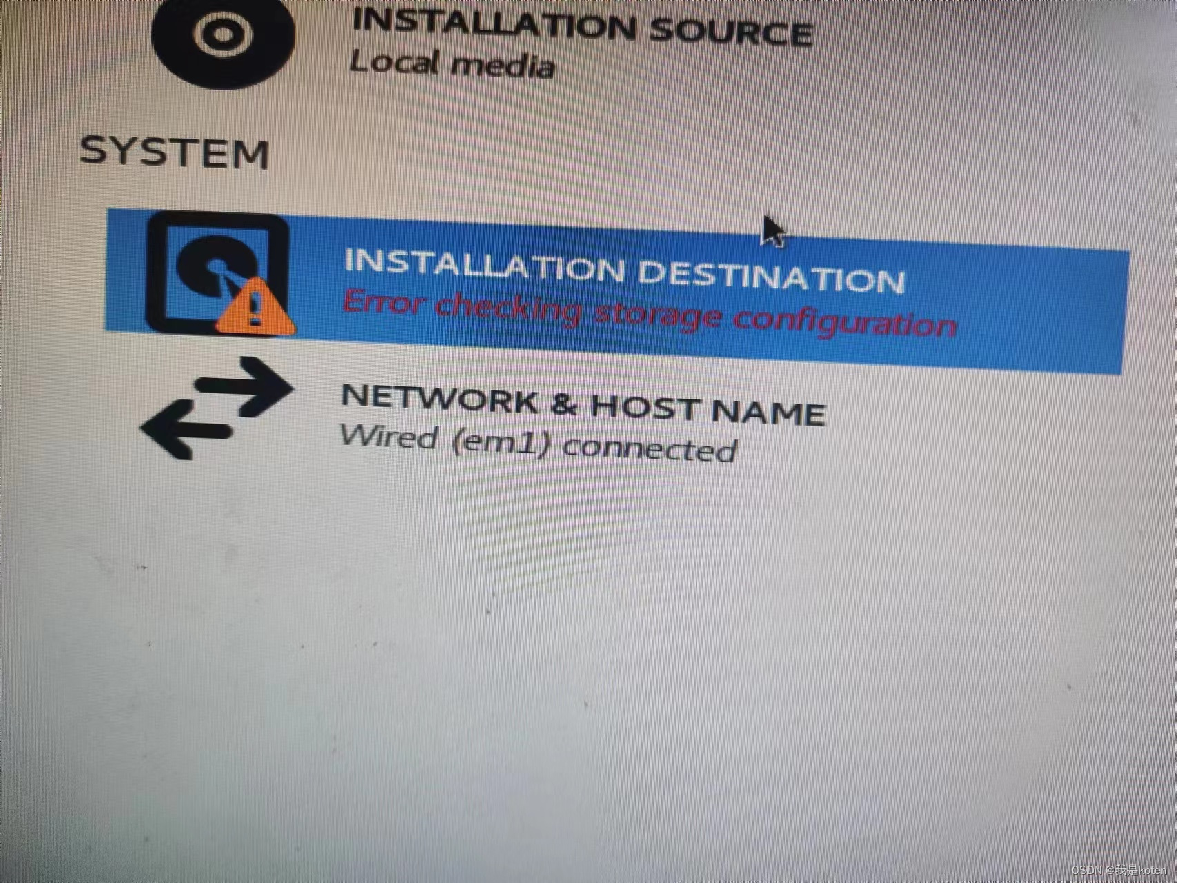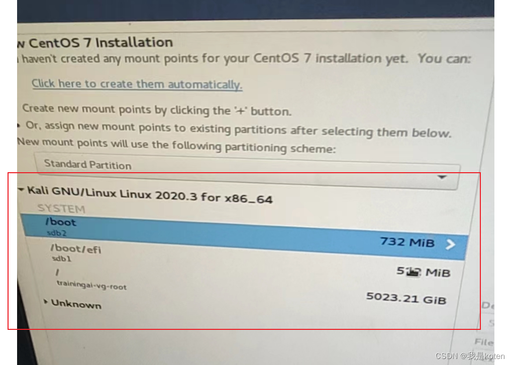 此处我犯了一个错误,没有给efi分区,导致一直显示下图问题,后来发现这个是GPT的磁盘,不是MBR,需要给efi分区,efi是磁盘启动时候需要用到的分区。所以最少有三个分区,/boot、/boot/efi、/