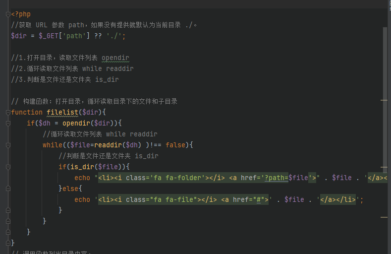 通过分析代码,我们可以得知这是通过path进行传参来把需要读取的目录参数传递进去通过调用文件列表函数进行读取并显示。