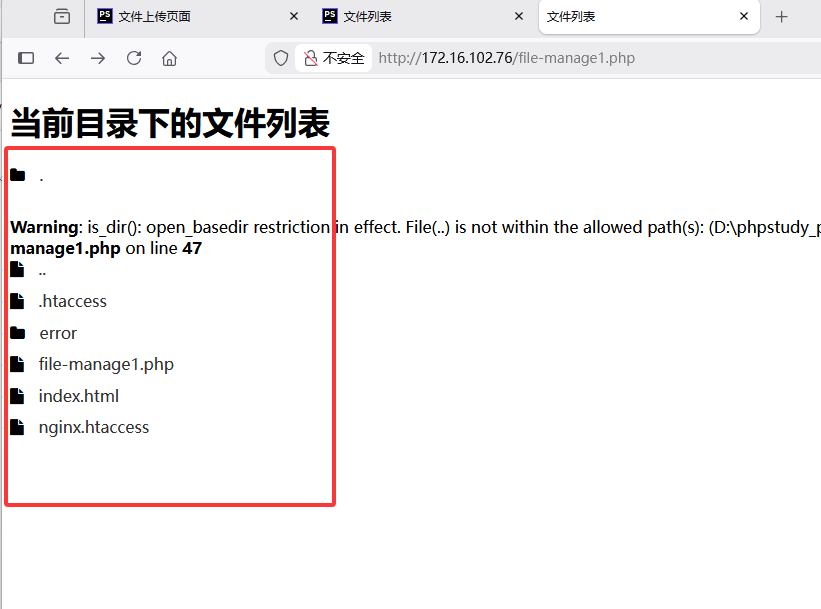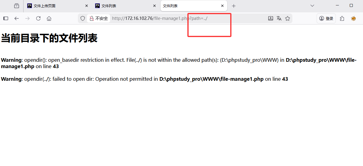 可以发现已经无法读取上一级文件了,并且PHP也给出了报错提示:PHP 给你的脚本设置了 “访问禁区”——只允许你操作 **D:phpstudy_proWWW** 这个文件夹里的内容,但你的代码在第 43 行尝试打开 ../(也就是 WWW 的上一级文件夹 D:phpstudy_pro),这个操作超出了 PHP 允许的范围,所以被拦截了,同时抛出警告告诉你 “操作不被允许”。