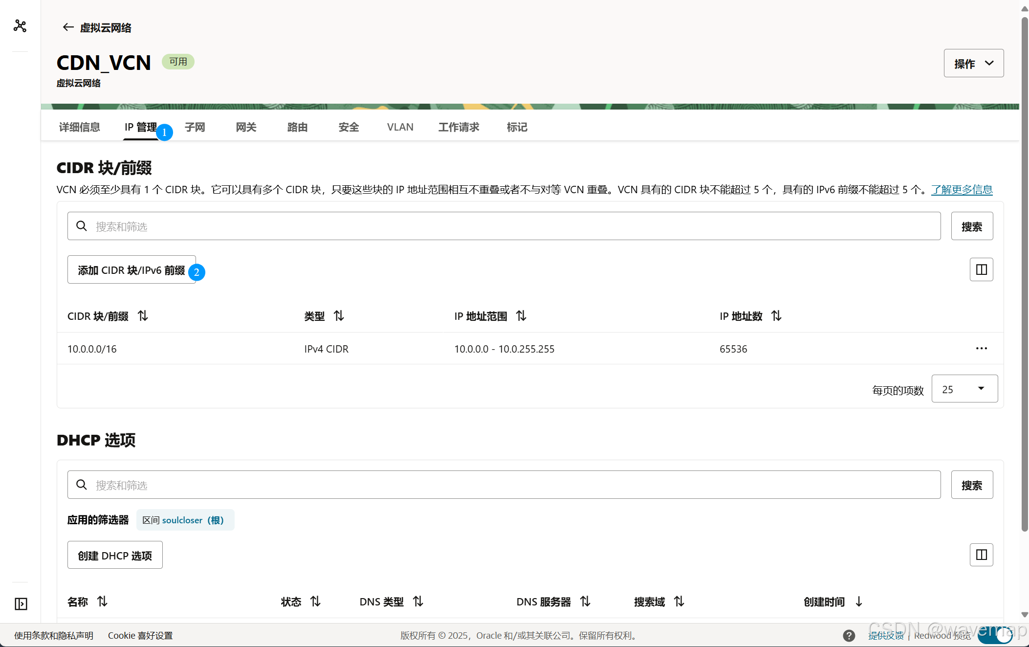 在 VCN 详情页面,导航到IP管理–>找到 CIDR 块 /前缀 部分。