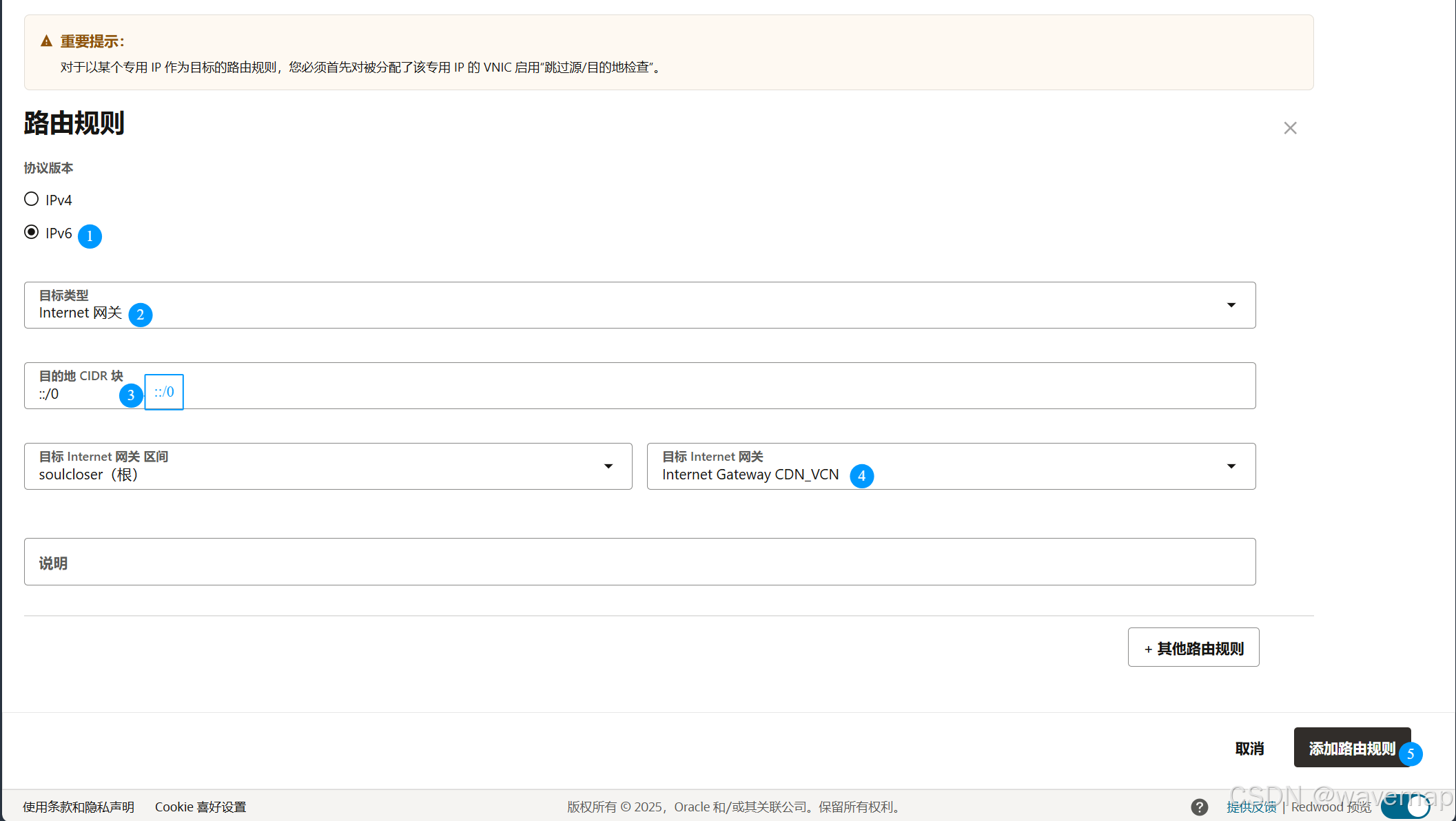 ::/0(这代表互联网上的所有 IPv6 地址)。 - 目标互联网网关 (Target Internet Gateway): 从下拉列表中选择附加到你 VCN 的那个互联网网关。