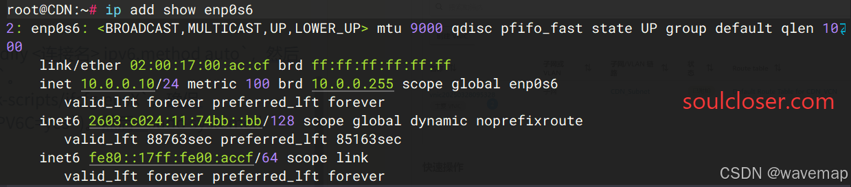 enp0s6,如图可以看见网卡的IPv6地址和刚才手动配置的是相同的。