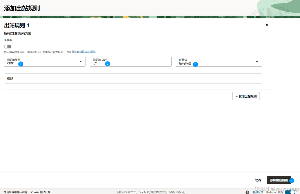 CIDR, 目的地CIDR::/0, IP协议所有协议,最后添加出站规则。