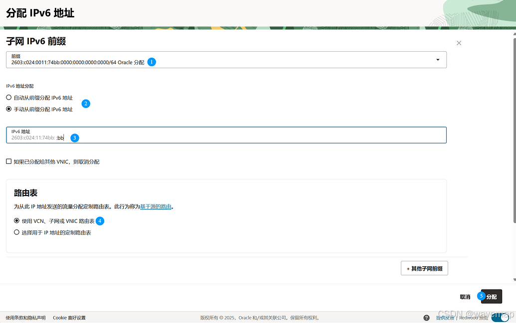 接下来,为实例所在的子网分配一个来自 VCN 的 IPv6 CIDR 块,通常是 /64。