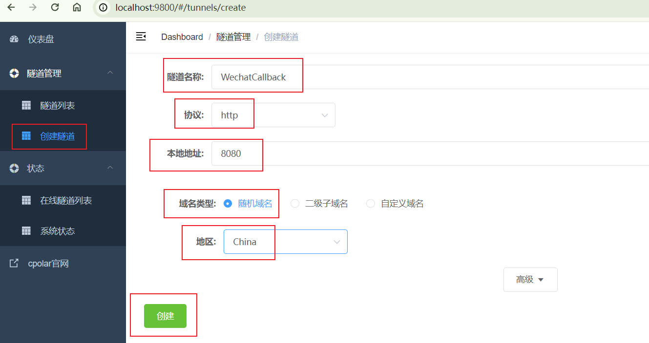 登录后,点击左侧仪表盘的隧道管理——创建隧道,创建一个本地服务的http隧道
