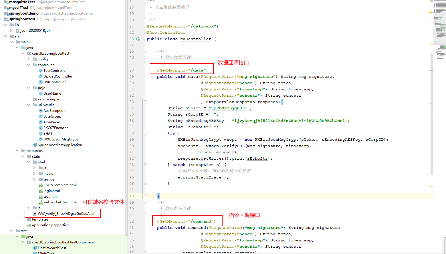 我们按照企业微信相关文档要求,编写回调校验接口,接口逻辑是一样的,同时把可信域名校验文件放到静态文件根目录下面,具体以您自己本地服务为准,本例只是以Java Spring Boot 为例子,设置后,运行本地接口服务,注意服务端口需要设置和cpolar中填写的端口一致,本例是8080端口!