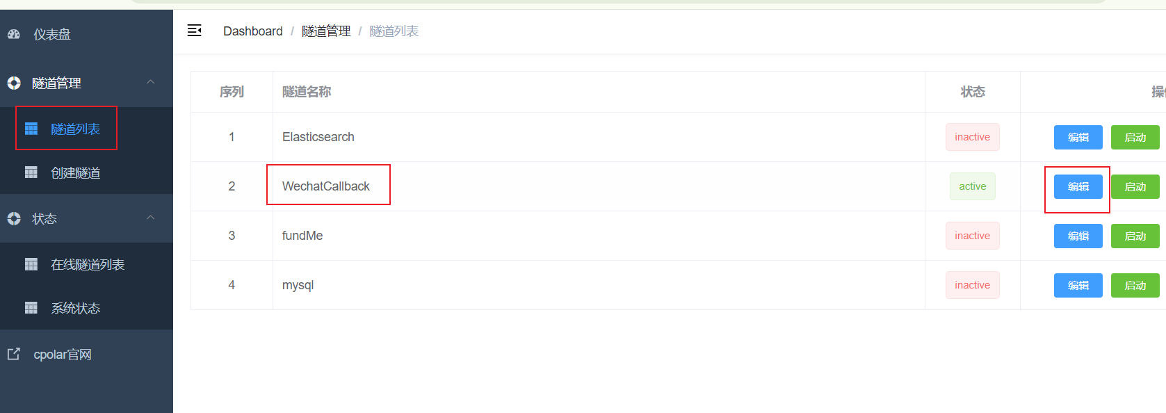 登录cpolar web UI管理界面,点击左侧仪表盘的隧道管理——隧道列表,找到所要配置的隧道,点击右侧的编辑