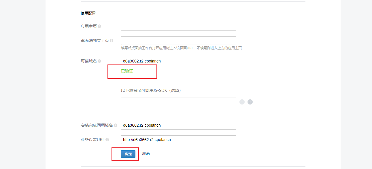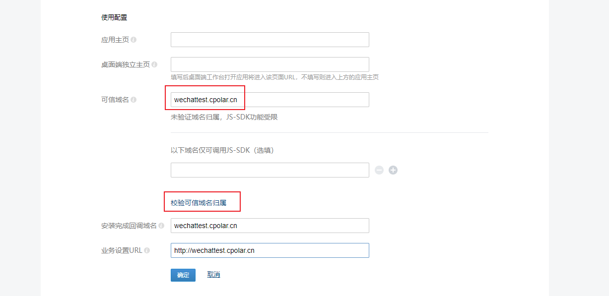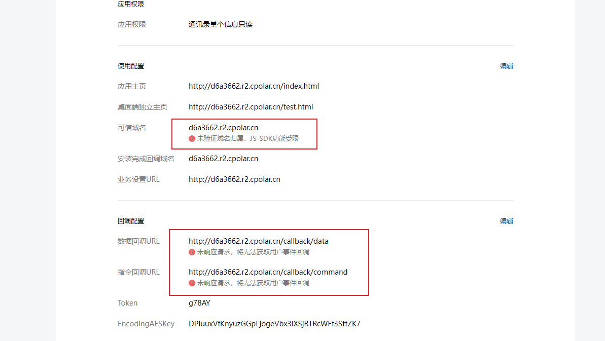 下面把企业微信开发者里面的应用配置参数地址换成cpolar中固定的域名地址,首先可信域名验证修改,点击编辑